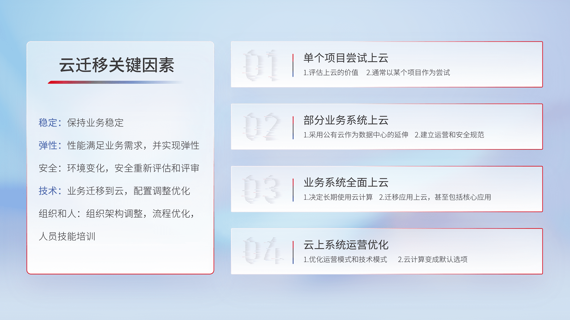 结合实际业务,,,,从规划设计、、、、云平台选型、、、云原生改造、、、数据迁移、、集成交付,,,迁移全过程为客户识别最佳上云路径,,,,做好风险识别管理,,设计网络架构、、、身份权限、、、、安全审计合规、、、、操作审计、、、、日志审计、、、监控告警策略、、、、多站点容灾设计等,,,,对云上基础设施进行整体规划,,,提升IT治理水平,,以满足弹性、、、、高可用、、、、高性能的需求。。